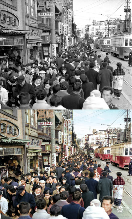 北國新聞夕刊連載「カラーでよみがえる、ふるさと」より(2021年4月3日掲載分)。 1959(昭和34)年1月2日の初売りで賑わう金沢市片町。旧大和(現・片町きらら)から香林坊交差点へ人並みが連なる。